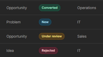 Every submission moves through a workflow: New → Under Review → Converted or Rejected. Submitters are kept informed.